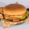 Pane*, doppio hamburger, formaggio Cheddar, bacon croccante, pomodoro, insalata iceberg e salsa ketchup - servito con patate french fries
