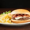 Pane, hamburger, formaggio fuso, bacon grigliato e julienne di cipolla arrostita - servito con patate french fries