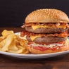 Pane*, doppio hamburger, formaggio Cheddar, bacon croccante, pomodoro, insalata iceberg e salsa ketchup - servito con patate french fries