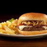 Pane, hamburger, formaggio fuso, bacon grigliato e julienne di cipolla arrostita - servito con patate french fries