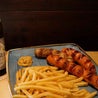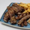 La grigliata per gli amanti della salsiccia, servita con polenta grigliata e patate fritte