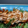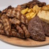 Galletto, costicine, salamelle, pancetta marinata e grigliata, Hamburger da 220gr. e wurstel, rucola e grana, polenta una cascata di patatine dippers