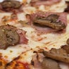 Con salsa di pomodoro, mozzarella, funghi porcini, porchetta, scaglie di grana, sale e pepe e origano