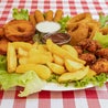 Mozzarelle, crocchette di pollo, anelli di cipolla, ciambelle di pollo al bacon e patatine fritte
