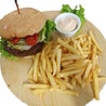 Pane hamburger, hamburger, lattuga, pomodorini, salse, accompagnato con patate fritte -- Hamburger bread, hamburger, lettuce salad, cherry tomatoes, sauces and french fries