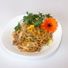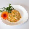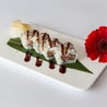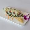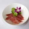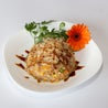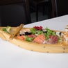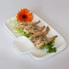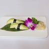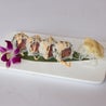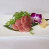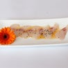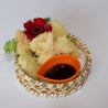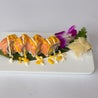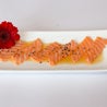 Insalata iceberg con carote pomodorino e fettine di pesce crudo misto al salsa Akira