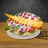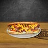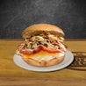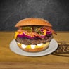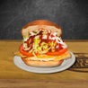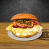 Pane, pulled pork, fagioli al chili, insalata, mais, jalapeno a rondelle, pomodoro, cipolla rossa, guacamole, salsa cheddar, bacon