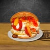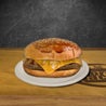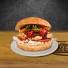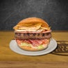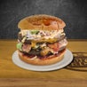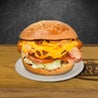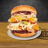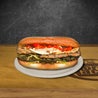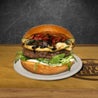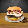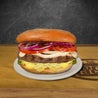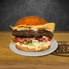 Pane, doppio hamburger di angus, bacon, cipolla cruda, insalata, pomodoro, fagioli al chili, salsa BBQ, formaggio, salsa comir, salsa miky