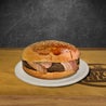 Pane, anelli di cipolla, hamburger di manzo, bacon, salsa comir