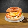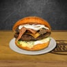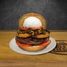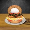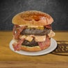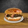 Pane, cipolla croccante, hamburger di angus, maionese tartufata, bacon, pecorino romano, peperoni grill, peperoncino, uova