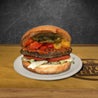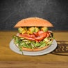 Pane, guacamole, hamburger vegetale, melanzane grigliate, pomodori confit, salsa yogurt