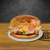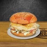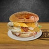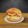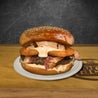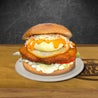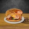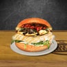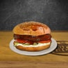 Pane, cipolla croccante, hamburger di manzo, maionese tartufata, bacon, pecorino romano, peperoni grill, peperoncino, uova
