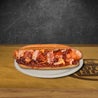 Pane, anelli di cipolla, fagioli rossi, salsa Hot Chili, bacon, salsiccia