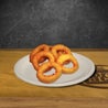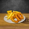 Anelli di cipolla fritti, patate fritte, salsa cheddar