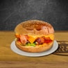 Pane, anelli di cipolla, friarielli, hamburger di angus, mozzarella intera, anelli di peperoncino, pomodoro