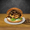 Pane, pulled pork, salsa cheddar, bacon, cipolla croccante, cipolla rossa, salsa Alma
