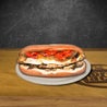 Pane, crema aceto balsamico, hamburger di angus, maionese, melanzane grigliate, pomodori confites, rucola, scamorza affumicata, zucchine grigliate